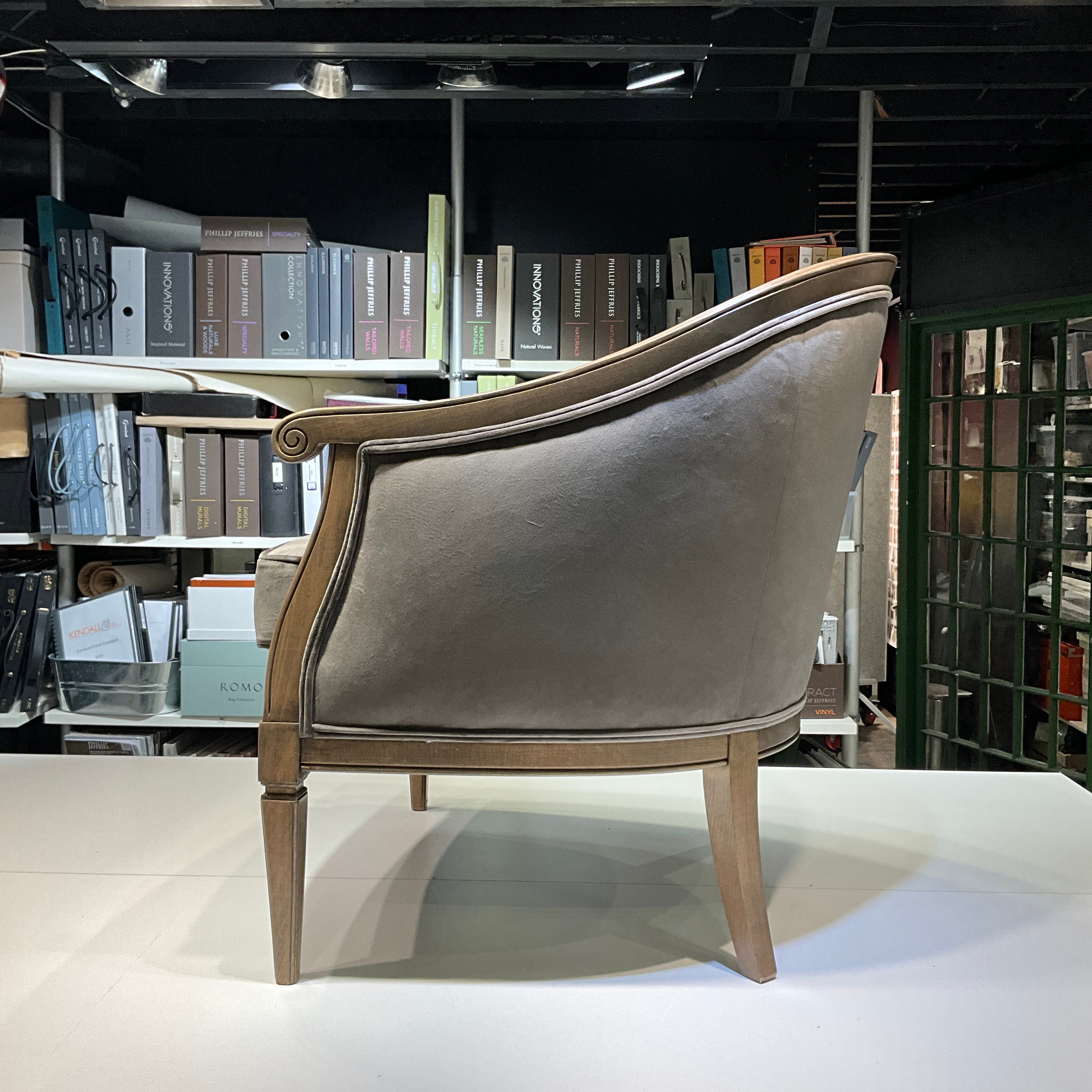 From our Bespoke Upholstered Furniture Collection. This floor model has a beautifully stain wood frame and a plush soft grey velvet