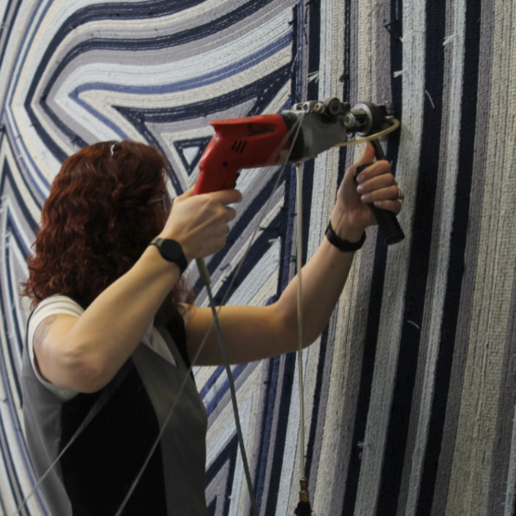 Crafted using a Tufting Gun, this technique punches individual fibres into a stretched canvas, following a pre-drawn design. Once fully piled and hand-sheered, the rug is removed from the frame, and a cotton backing is applied to secure the fibres in place.
