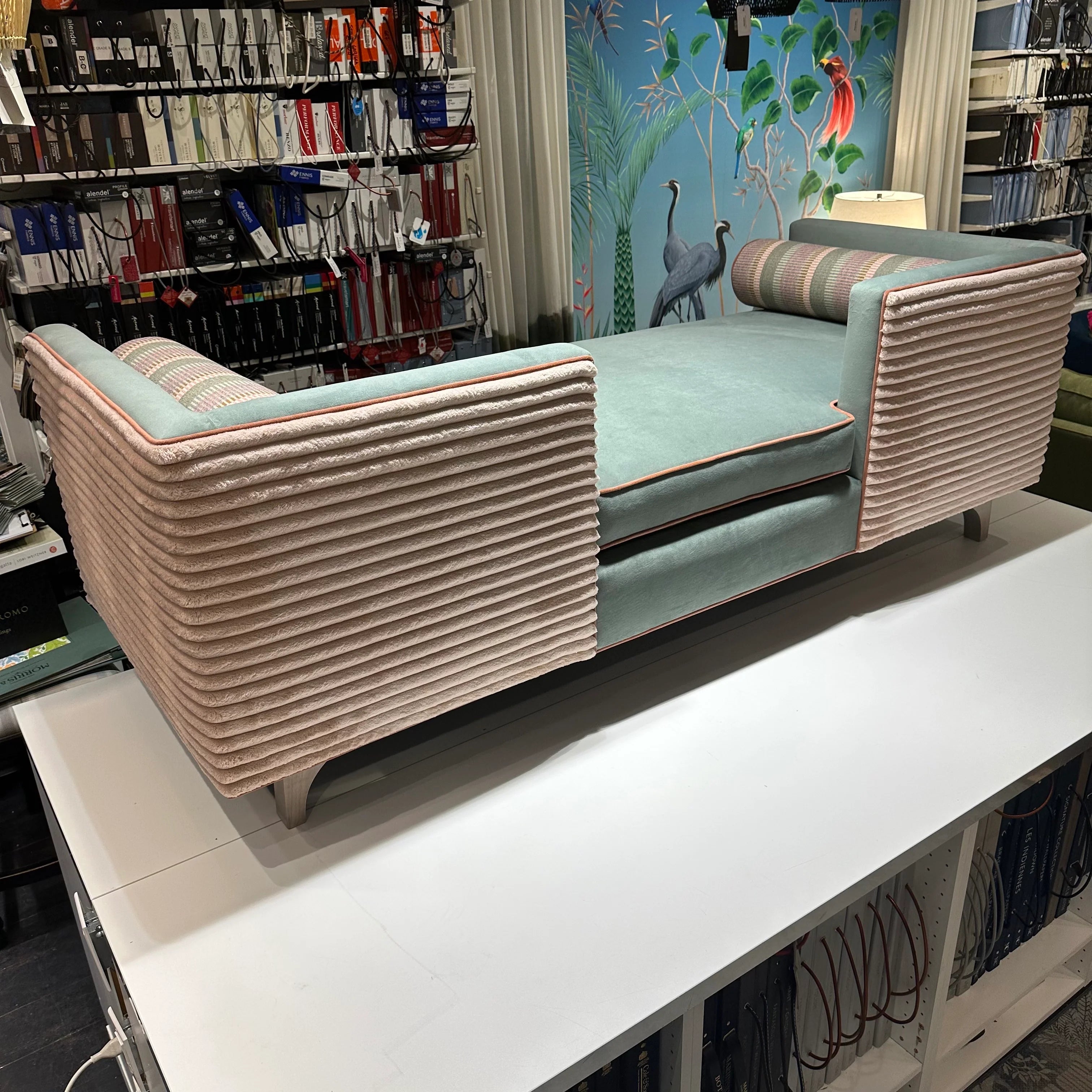From our Bespoke Upholstered Furniture Collection, the Tina Daybed is available in two standard sizes, with custom sizing available for a fee. Tina is a modern Divan; versatile in form & function: sofa by day & bed by night. Tina is piped throughout, both frame and cushions, to accentuate its clean lines. While the cylindrical side Bolsters gives a visual counter balance as they rest casually against the padded tuxedo Arms & Back.